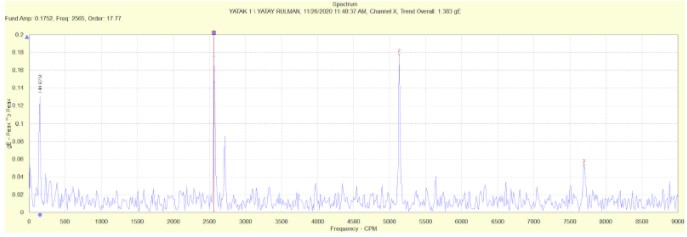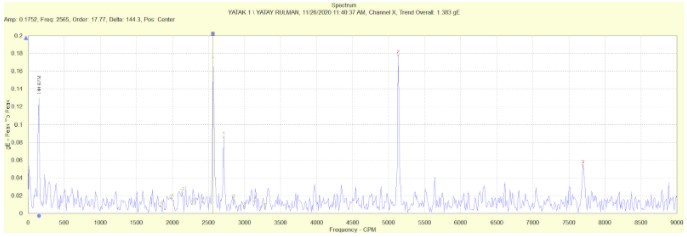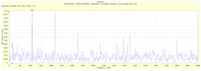 2- Pinyon yataklarında 18 diş sayısına sahip pinyon dişli ile değirmen çevre dişli arasında vuruntu sinyalleri gözlemlenmiştir. Bunun yanında 144rpm olan dönme devrinde yan bant oluşumları gözlemlenmiştir.
